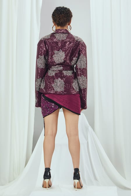 Red asymmetric draped skirt featuring floral hand embroidery detailing