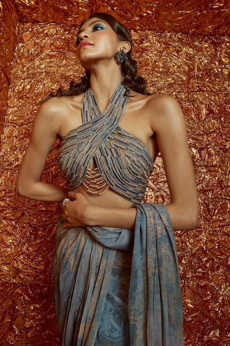 Grey Chiffon Abstract And Cording Halter Pre-draped Saree With Blouse