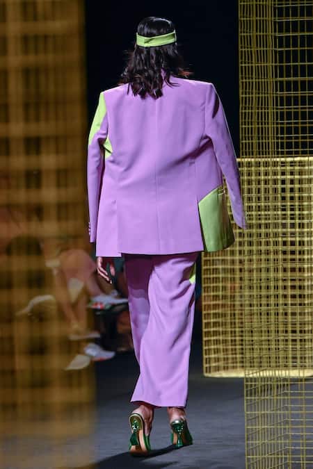 Lilac & lime green colorblock blazer with notched lapel collared neckline.