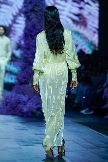 The collared slit dress & bralette worn by the model is not for sale., The outfits worn by the models at the back are not for sale.