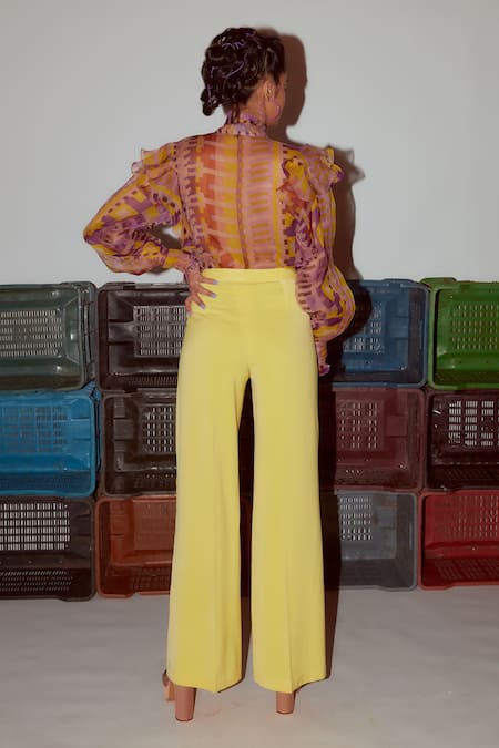 Lemon yellow organza top featuring a geometric print with full sleeves and a tie-up neckline