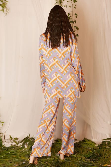 Multicolored kurta with all-over geometric print, mandarin collar & full sleeves. Comes with pant.