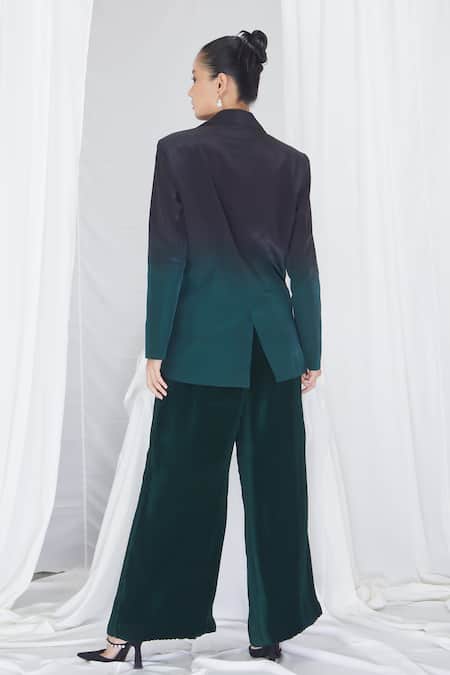 Emerald green ombre blazer featuring a notched lapel and full sleeves. Paired with pleated wide-leg pants made from crepe fabric.