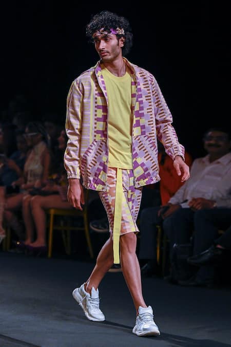 Multi colored bomber jacket with geometric pattern prints.