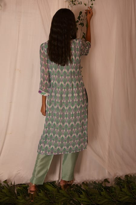 Mint kurta with all-over geometric print, hand embroidered yoke & straight silhouette. Comes with pant.