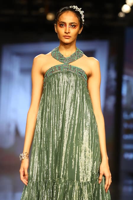 Shop_Nirmooha_Green Lurex Crew Neck Tiered Midi Dress_at_Aza_Fashions