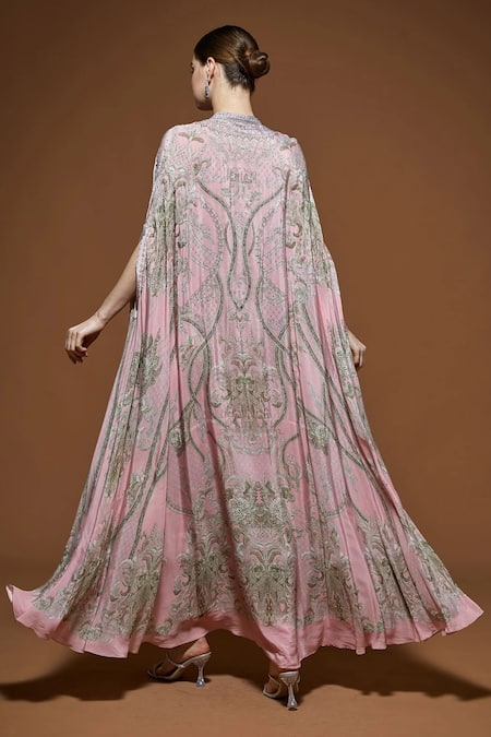 Pink Crepe Rhinestones High Neck Designer Embroidered Cape And Gown Set
