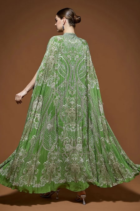 Green Crepe Rhinestones Keyhole Neck Designer Cape And Gown Set