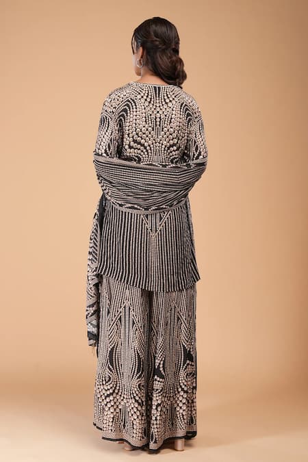 Black kurta featuring rhinestone embroidery and a keyhole neckline. Paired with a matching sharara and dupatta for a complete look.
