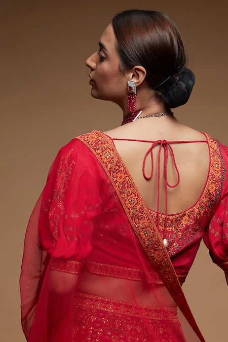 Red lehenga featuring rhinestone embroidery and an attached cancan. Paired with a matching blouse and dupatta.
