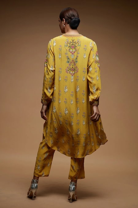 Yellow kurta featuring rhinestones embroidery and a straight silhouette. Paired with matching pants for a complete look.