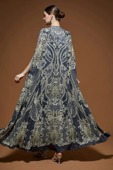 Rhinestone embellishments along the neckline, Intricate hand embroidery throughout the cape, Flowing cape design for added elegance