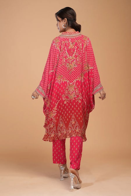 Red kaftan featuring rhinestone embellishments and a flowy silhouette. Paired with matching pants that complement the kaftan design.