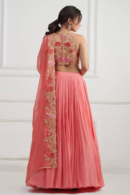 Peach Georgette, Organza, Crepe Embroidery, Sequins V-neck Blouse Lehenga Set