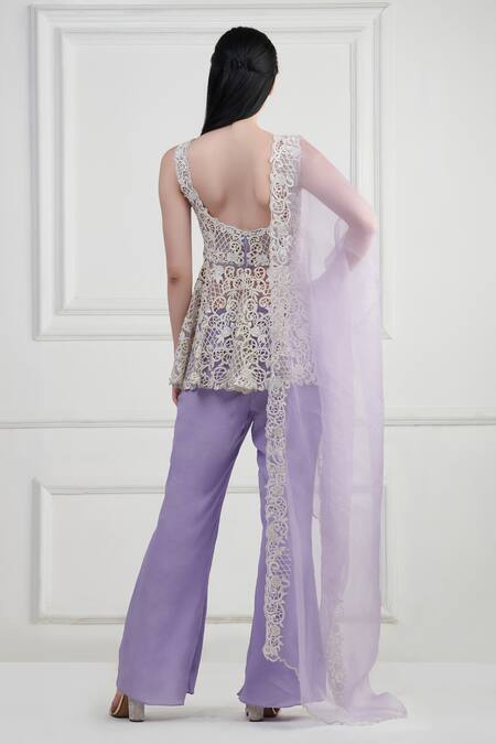 Lilac peplum kurta featuring floral jaal embroidery with thread, pearl, sequin, and bead work. Paired with a matching pant and a border embroidered sheer dupatta.