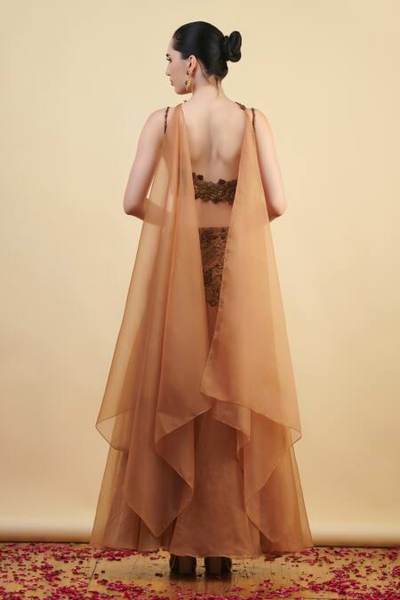 Gold Organza, Net, Crepe Cut Work, Embroidery, Floral Placement Lehenga Set