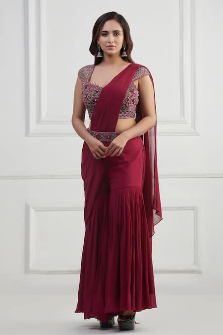 Purple pant saree featuring tiered detailing and an embroidered belt. Paired with a padded blouse adorned with bead, cutdana, and french knots in a floral pattern.