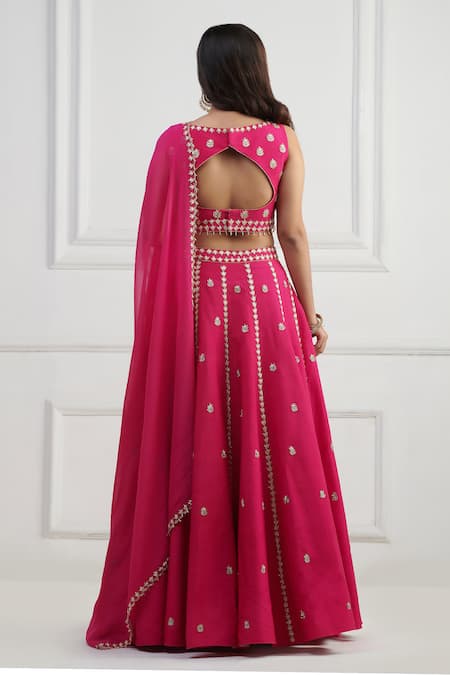 Pink lehenga featuring thread and cutdana embroidery in floral stripe placement. Paired with a back cut-out blouse and a border embroidered sheer dupatta.