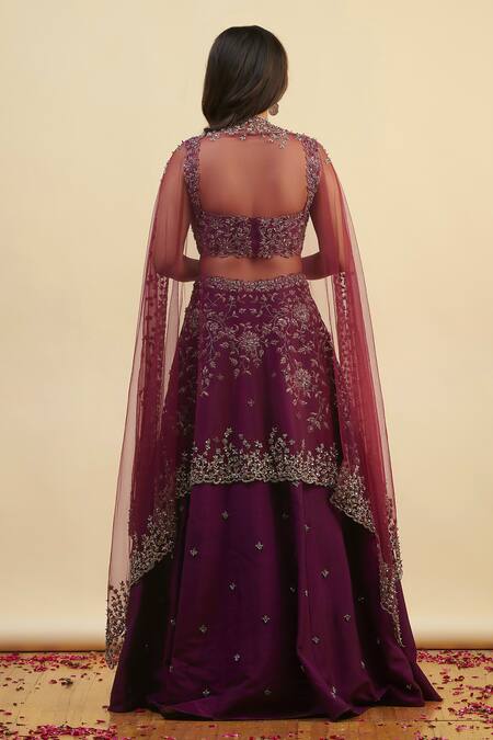 Purple lehenga featuring zardozi, bead, and sequin embroidery in floral placement. Paired with a padded embroidered blouse and a border embroidered sheer dupatta.