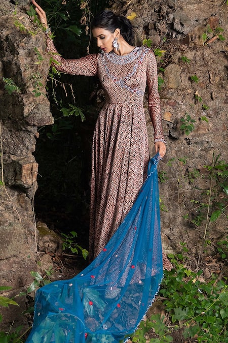 Peach anarkali with all-over printed motifs & embroidered yoke. Paired with contrast indigo blue dupatta with zardozi work.