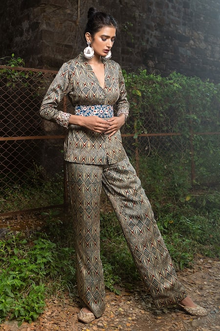 Indigo blue flared pant with all-over geometric printed motifs. Paired with a jacket & embroidered belt.