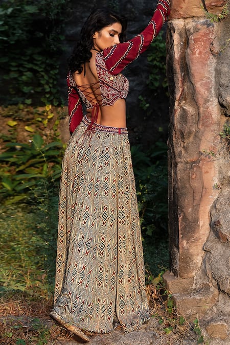 Indigo lehenga with all-over contrast printed motifs. Paired with maroon embroidered blouse with churidar sleeves.