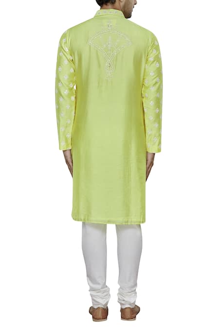 Green tinted yellow kurta with all-over floral motif work. Comes with white churidar.