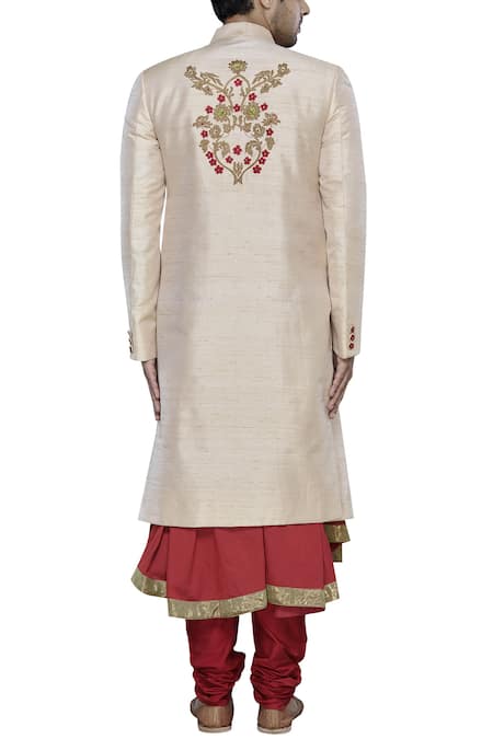 Beige sherwani with placement floral motif work. Paired with brick red flared kurta & plain churidar. This set comes with embellished stole.