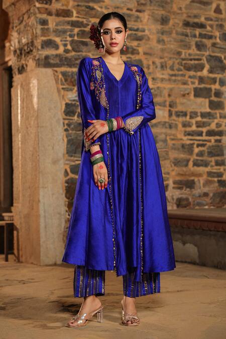Buy_Label Niti Bothra_Blue Silk Pearls, Applique, Sequins V-neck Banarasi Embroidered Anarkali Set_Online_at_Aza_Fashions