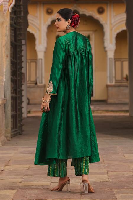 Green Anarkali featuring a V-neck design with intricate pintucked details. Paired with a flared jacket and striped palazzo, all crafted in pure Banarasi spun silk.