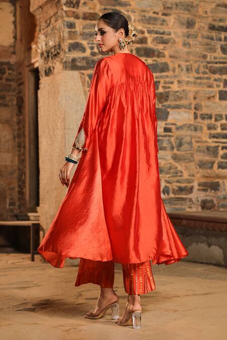 Orange Anarkali set featuring a flared design with intricate pintucked details. Paired with a matching jacket and woven palazzo adorned with resham, zari, and sequin work.