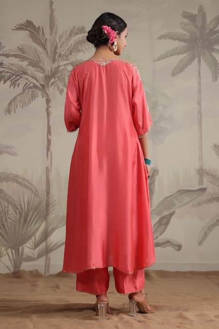 Buy_Label Niti Bothra_Pink Silk Beads, Sequins Roselyn Embroidered Asymmetric Kurta And Palazzo Set _at_Aza_Fashions