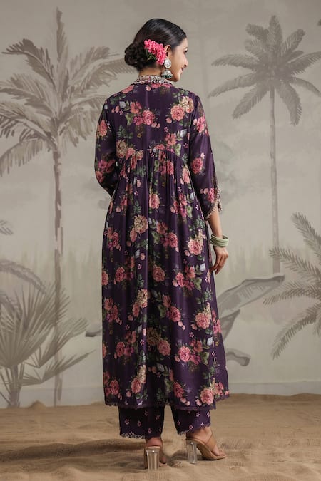 Buy_Label Niti Bothra_Purple Silk Beads, Sequins, Vintage Rose Print Gathered Anarkali With Palazzo