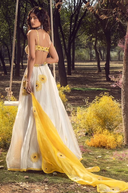 Off white lehenga featuring 3D sunflower motifs and a layered design. Paired with a padded blouse adorned with pearl embellishments and a sunflower-patterned dupatta.