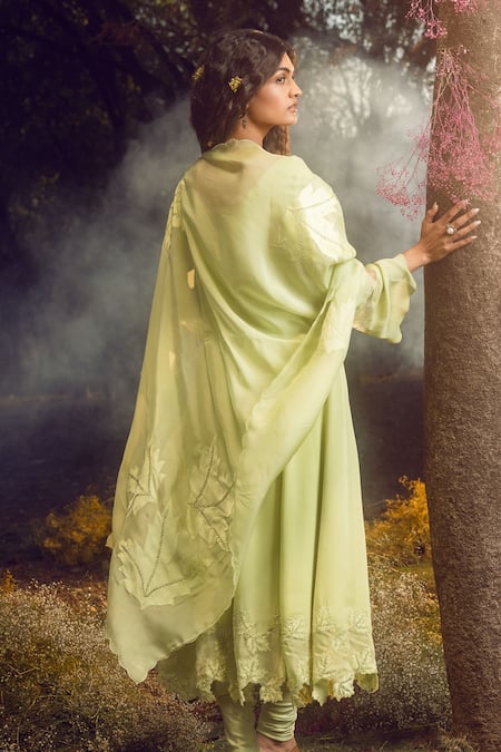 Soft green A-line flare anarkali with satin leaf applique detailing. Paired with a churidar and a scallop-trim dupatta featuring sequin embroidery.