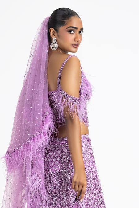 Lavender fish-cut lehenga with tonal floral geometric sequin, beads & crystal embroidery. Paired with an embroidered padded corset blouse featuring cold shoulder sleeves and a cut work embroidered bordered dupatta with feather tassel details.