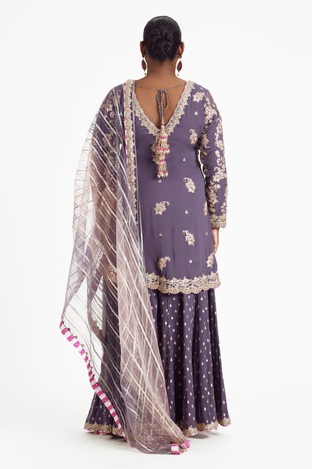 Purple kurta featuring a V neck, full sleeves, and intricate floral jaal pattern with gota patti, Dori, sequin, and bead embroidery. Paired with a flared sharara showcasing a banarasi woven floral butti design and a net embroidered dupatta.