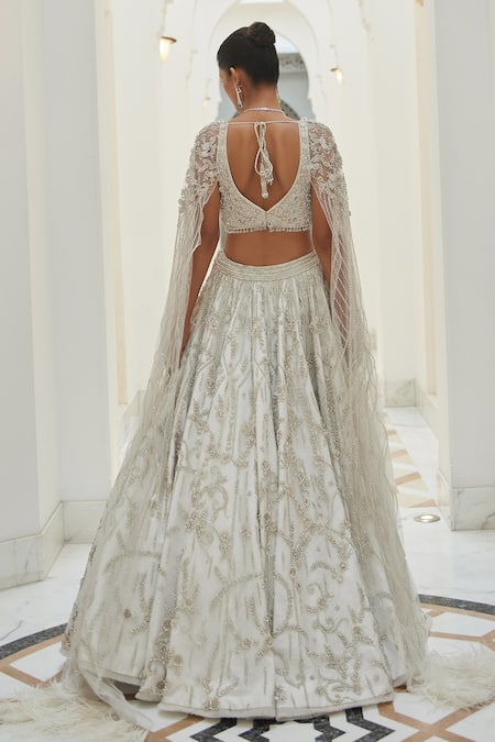Ivory lehenga featuring all-over floral garden tonal embroidery with sequins, silver beads & crystals. Paired with a sweetheart neck padded blouse adorned with long bird sleeves and dangling glass beads hem.