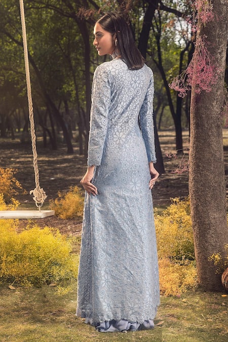 Ink blue lehenga featuring an asymmetric hemline and satin applique floral design. Paired with a full sleeve organza jacket with a V neck and sheer panels.