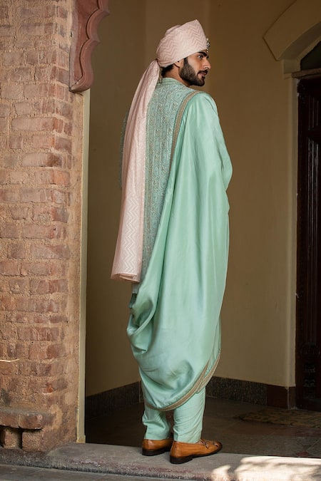 Mint green monga achkan featuring all-over tonal resham embroidery embellished with dabka and bead. Paired with tussar silk kurta and cotton lycra pant.