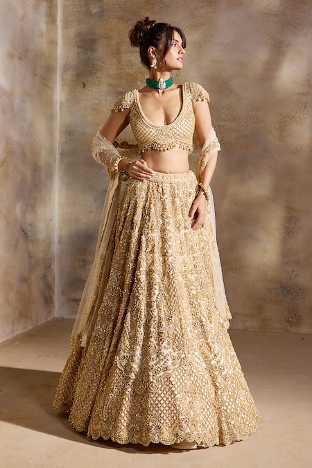 A gold cream net and satin lehenga featuring cutwork embroidery with gold metallics, beads, sequins, and crystals, complete with an attached cancan. It is paired with a padded blouse and a coordinating net dupatta.