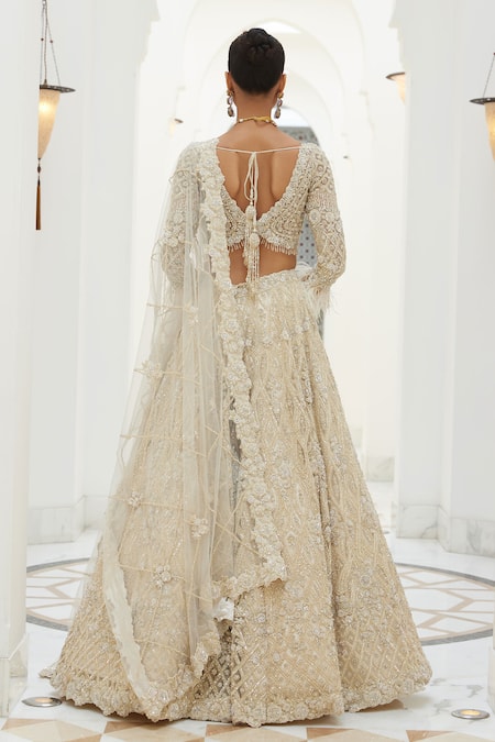 Ivory lehenga featuring all-over lily flora bloom tonal embroidery with dori, sequins, silver beads, and crystals. Paired with a plunging V neck padded blouse with feather hem and a floral embroidered net dupatta.
