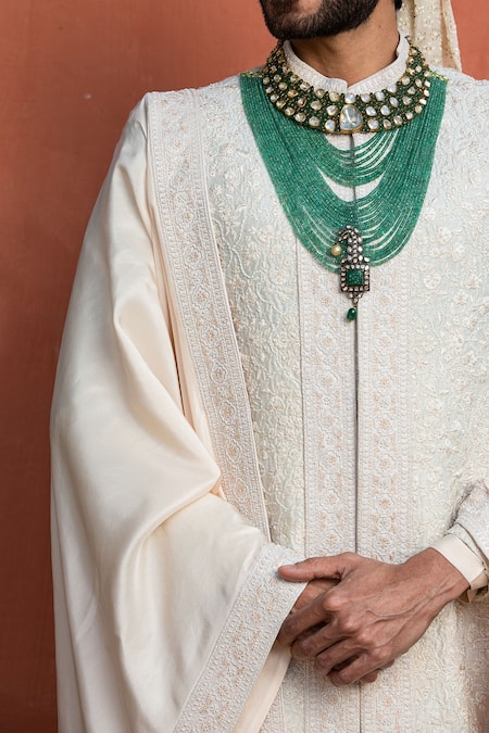 Ivory matka tussar achkan featuring all-over embroidery with resham, cutdana, and bead work. Paired with a kurta and cotton lycra trouser.