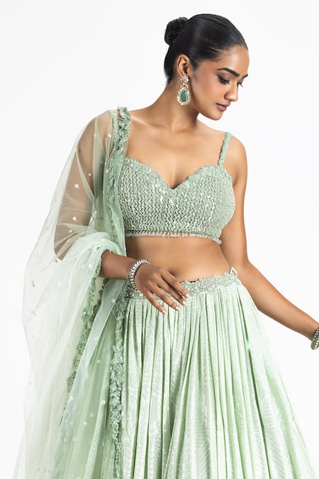 Jade green ombre lehenga featuring a frill border and all over geometric pattern. Paired with a padded blouse adorned with tonal Dori, sequin, crystal, and beads embroidery along with a frill border embroidered dupatta.
