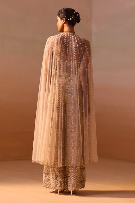 Peach corset top featuring cutwork embroidery and embellished with beads, pearls, and crystals. Paired with flared embroidered trousers and a matching cape dupatta.