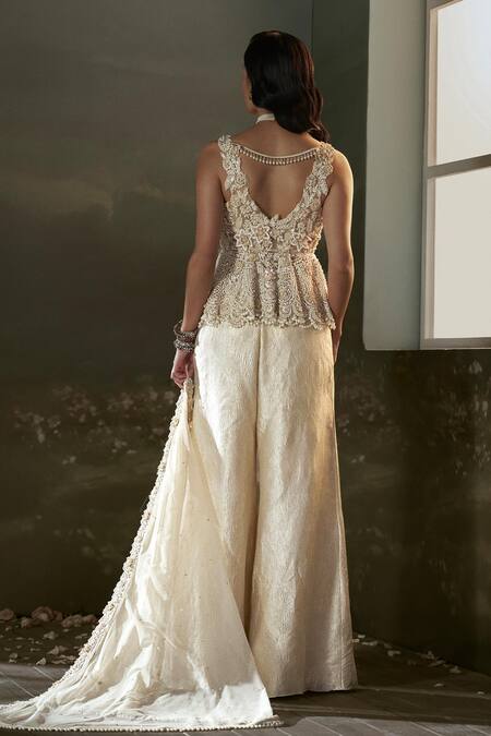 Cream peplum top featuring sleeveless design with intricate bloom embroidery in resham, crystal, beads, and pearls. Paired with a crinkled organza sharara and a floral embroidered dupatta.