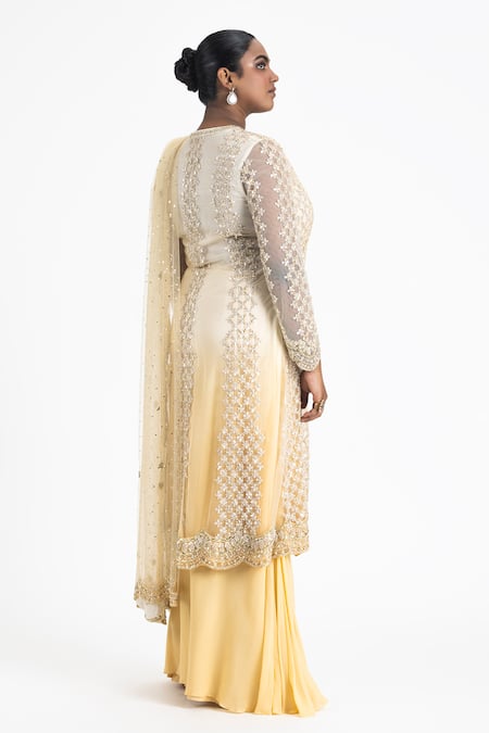 Gold jacket featuring all-over sequins, beads, and crystal embellishments. Paired with a shimmer finish sharara and embellished dupatta.