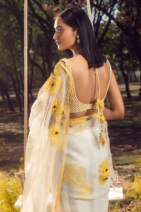 Off white saree made in organza featuring sunflower applique with pearl, beads, and cutdana embellishments. Paired with a pearl embroidered blouse and a satin lycra petticoat.