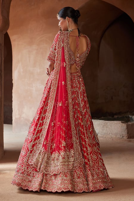 Red vintage lehenga featuring intricate zari, sequin, and bead embroidery. Paired with an embroidered blouse and a net dupatta with scalloped cut work border.