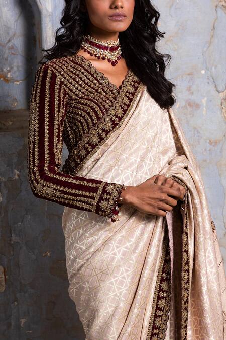 Back cutout blouse design, Scallop and tassel borders, Intricate antique dabka and zari work
